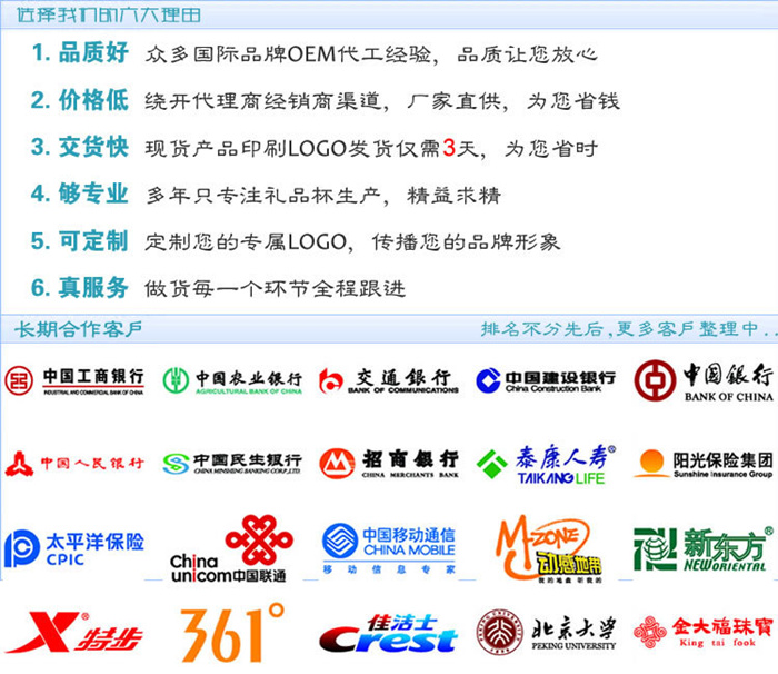 本工廠注重打造產(chǎn)品的品質(zhì),服務(wù),客戶的精準(zhǔn)貨期,讓客戶下單之后無(wú)后顧之憂。銷售網(wǎng)絡(luò)已經(jīng)遍布全國(guó),在全國(guó)部分城市設(shè)立有辦事處,歡迎空白區(qū)域的禮品商,商超、禮品公司,廣告公司,批發(fā)渠道商合作,共同打造集團(tuán)化的優(yōu)勢(shì),共創(chuàng)美好未來(lái)。